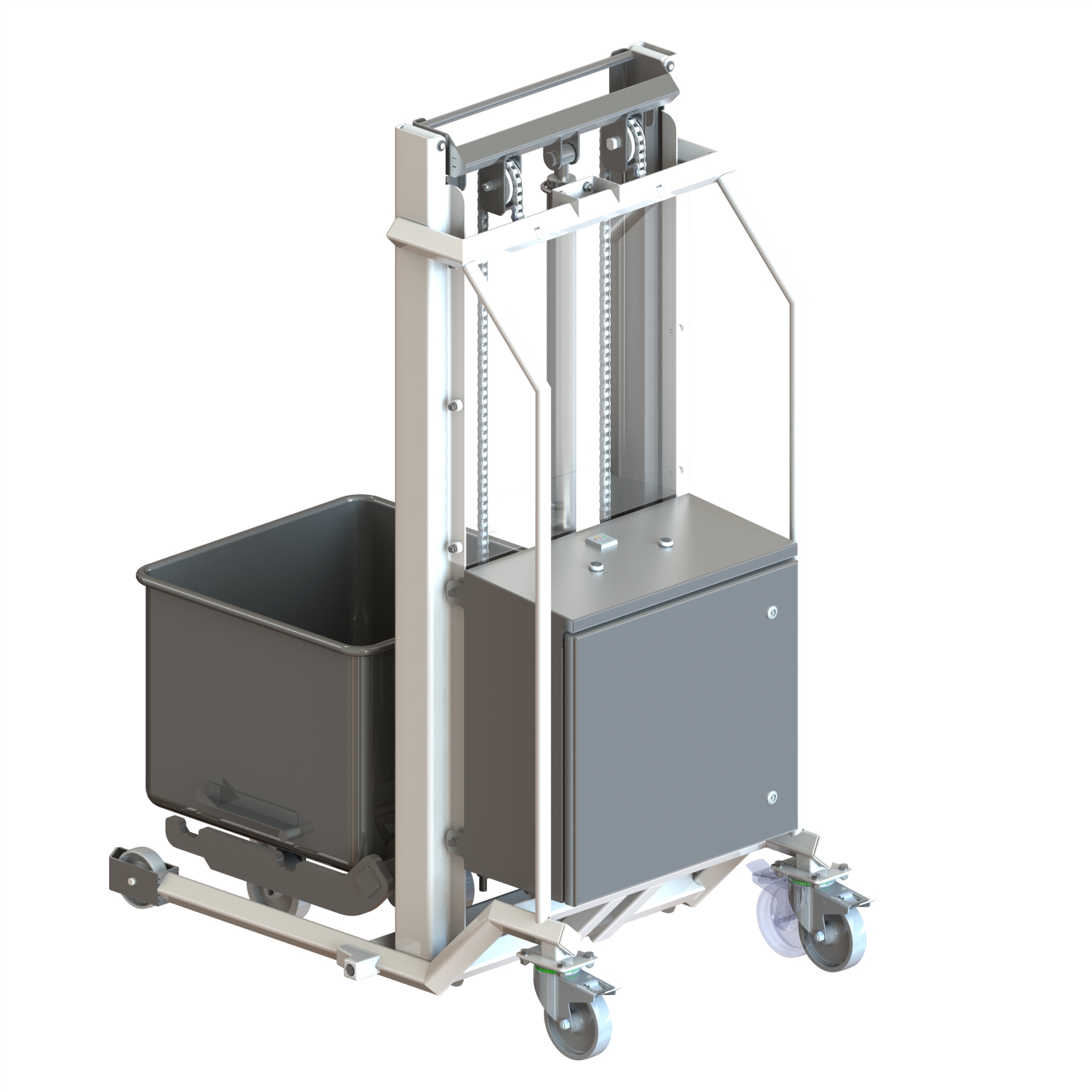 The Unitech Engineering Tote Bin Stacker is a high-lift, stainless steel handling solution designed for safely lifting, stacking and positioning tote bins in hygiene-critical environments.